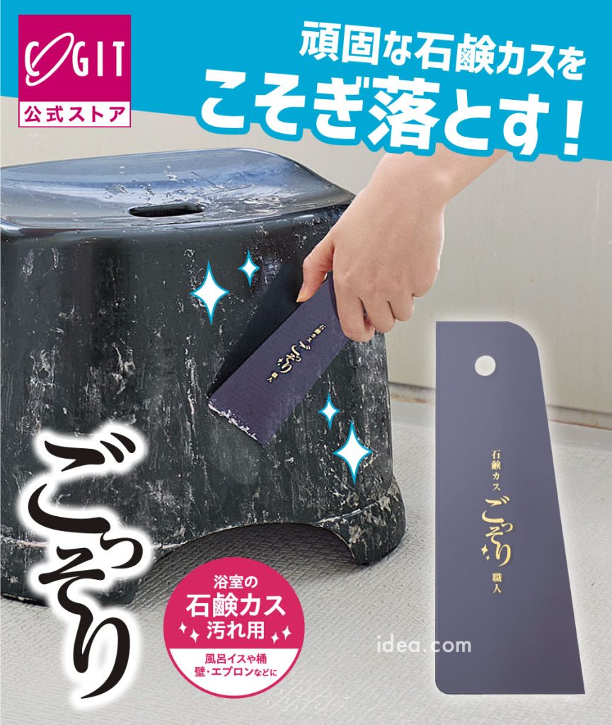 浴室にこびりついた石鹸カス汚れには『石鹸カスごっそり職人』がおすすめ。こするだけで、固まった石鹸カスをごっそり落とします。