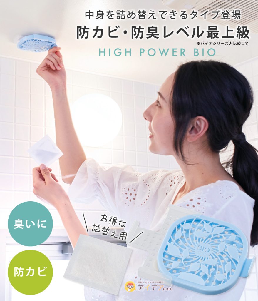 お風呂のカビや臭い対策におすすめなのが『ハイパワーバイオお風呂のカビきれい 詰替え用』。天井に貼るだけで9種類のカビを予防します。
