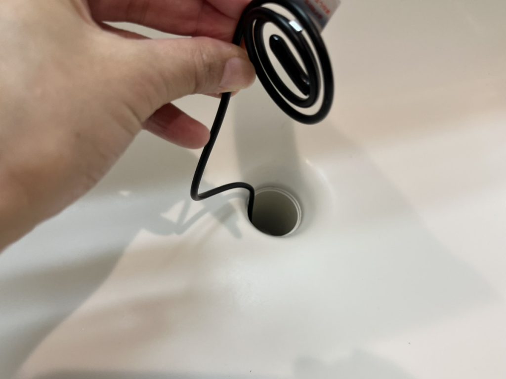 必ず時計周りにくるくる回して、排水トラップの底に当たる場所まで入れます。その場で何度かくるくる回転させて髪の毛を絡めとります。