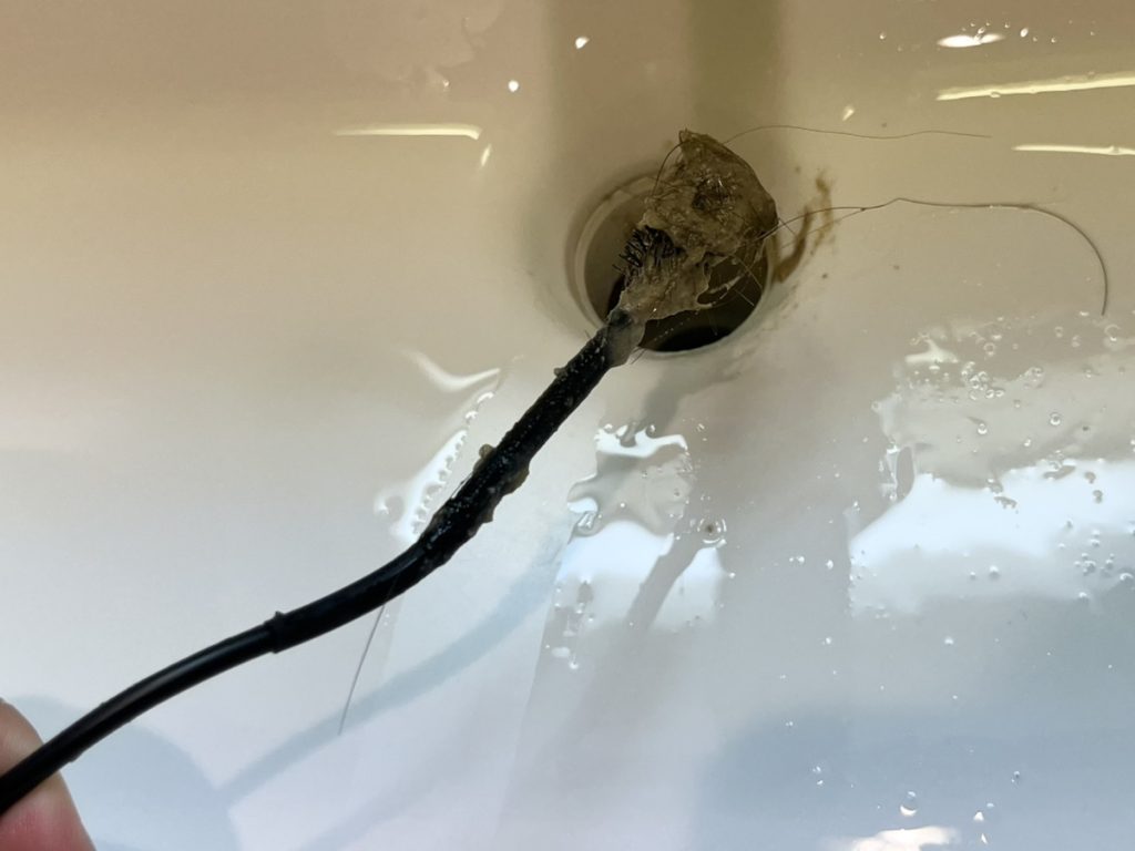 ゆっくり引き上げると、想像以上に髪の毛やヘドロが取れました。普段、洗面台の掃除をしているつもりでも、排水口の奥にはこれだけの汚れが溜まっているなんて、驚きです!