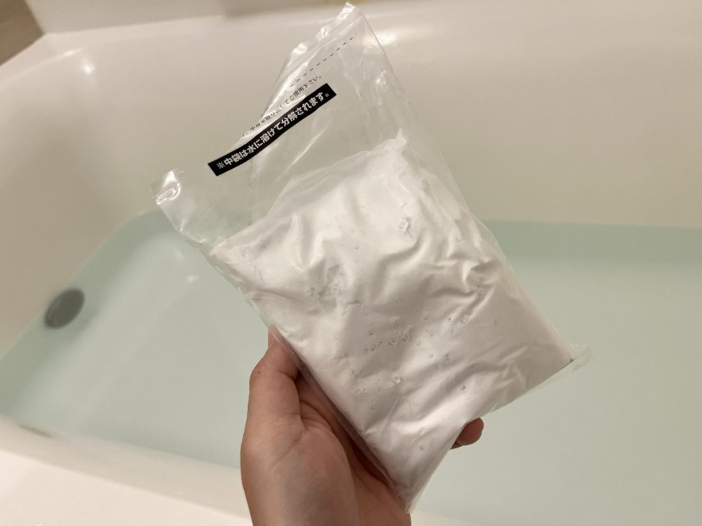 使い方はとても簡単で、お風呂の残り湯(180〜200L)にポリ袋から出した『お風呂にポイッ!』を1袋入れるだけ。袋は溶ける素材のため、入れる際は乾いた手で持つと安心です。