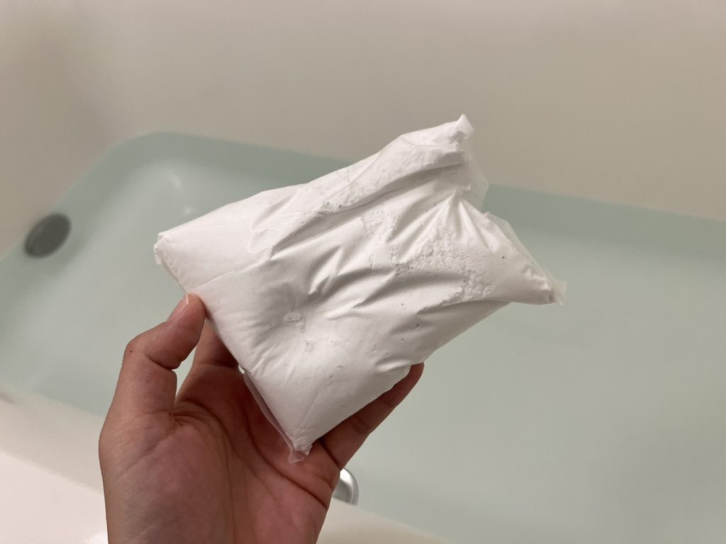 浴槽やお風呂用品をまとめて掃除するなら『お風呂にポイッ!』が便利です。お風呂上がりの残り湯に『お風呂にポイッ!』の袋を入れて、一晩つけ置きするだけでOK。