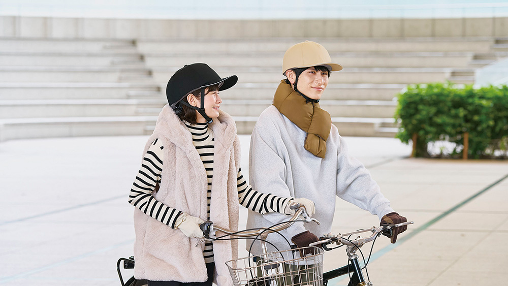 自転車ヘルメットの上から被れるおしゃれなキャップ。安全対策と防寒対策が同時にできる。おしゃれと安全性を両立。