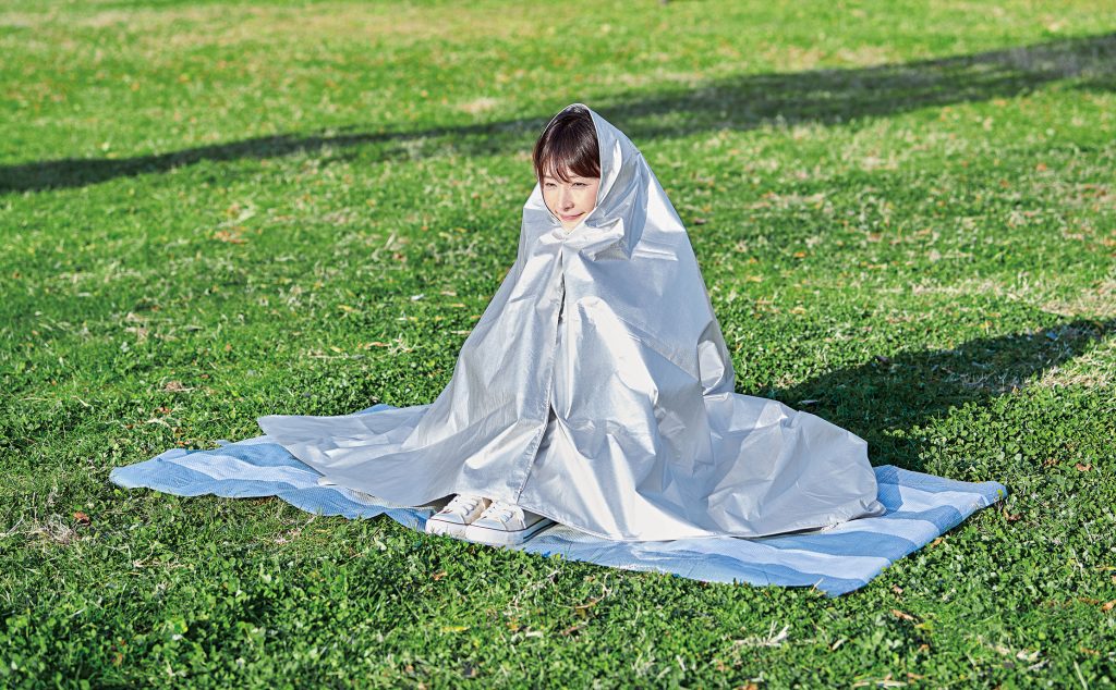 首も頭もまとめて守れる「フード付アルミブランケット」