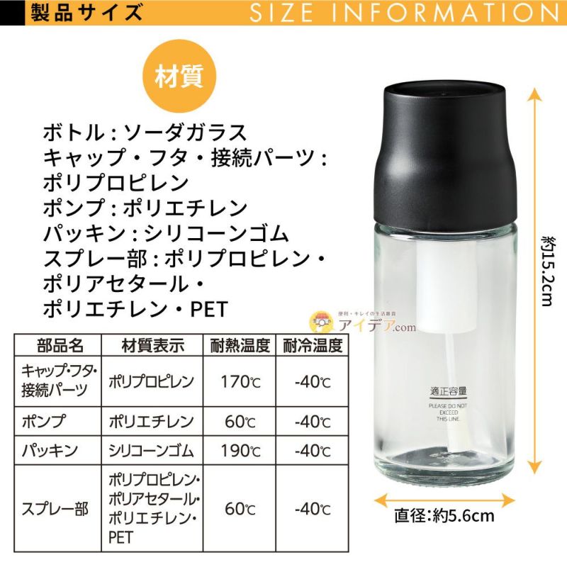| ■耐熱温度 | キャップ・フタ・接続パーツ:170℃、ポンプ:60℃、パッキン:190℃、スプレー部:60℃ | ||