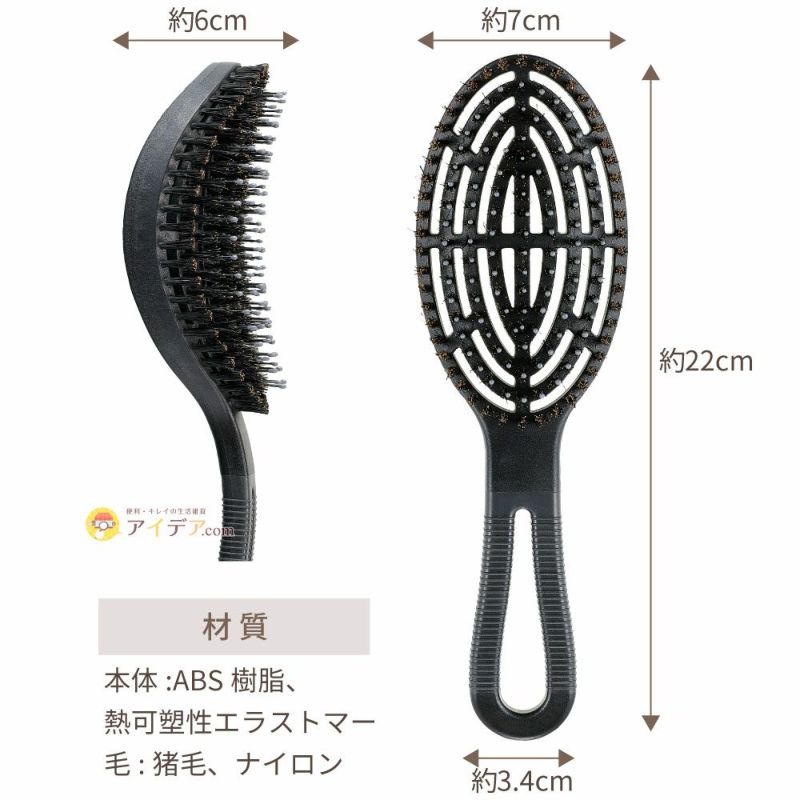 天然猪毛とナイロンの二層構造ブラシで髪や頭皮に優しく、空洞のある仕様でドライヤーの風を通すから髪を早く乾かしやすいのも特徴。ブラッシングやドライヤーを使って髪のボリュームアップやヘアセット、ブローやツヤ出しが可能。ブラシのカーブの形状が 頭にフィットし、頭皮のマッサージもできます。