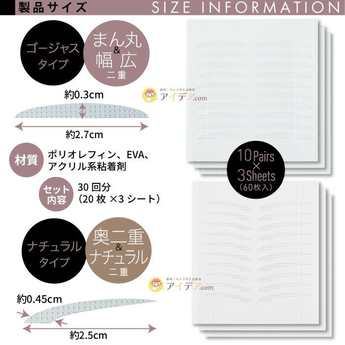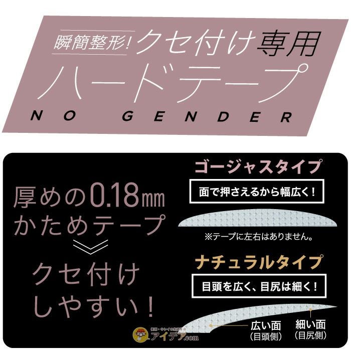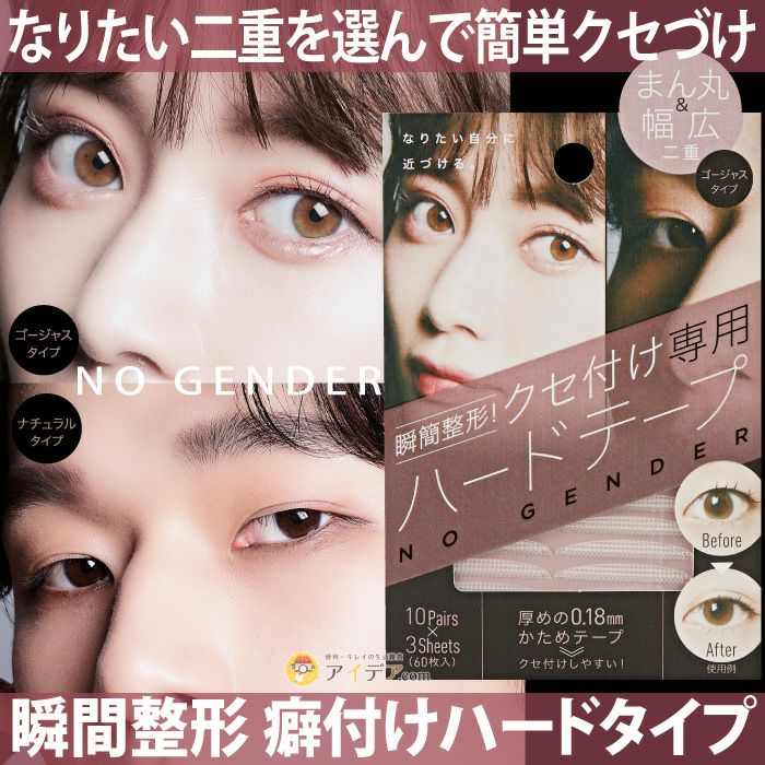 | 就寝中に、おウチ時間に、テープを貼って二重をクセ付け! 瞬間整形 癖付けハードタイプ ![]() 自分でなりたい二重の形を選んでおウチで簡単にクセづけ。厚めの0.18mmでかためのテープを使用しているので、ご自身でもクセ付けしやすいのが特徴です♪ 面で押さえるから幅広く二重をつくることが可能なゴージャスタイプは、まん丸二重・幅広二重になりたい人にオススメ♪ 目頭が広く、目尻は細くなったテープのデザインのナチュラルタイプは、末広がり二重・ナチュラル二重になりたい人にオススメです! ![]() ![]() ![]() ![]() ![]() ![]() ![]() ![]() 自分でなりたい二重を選べるのがNO GENDER時代のアイテープ! 【瞬間整形 癖付けハードタイプ】で、理想の二重をクセづけしてくださいね♪ |