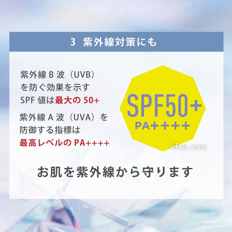 ノンケミカル処方のパウダーが肌にやさしく密着し、自然なツヤ感を残しながらさらりとした仕上がりに。皮脂やテカリを抑え、時間が経っても快適な肌状態をキープします。外出先でもサッと使えるため、メイクの上からでも手軽に紫外線対策をプラスできるのが魅力です。