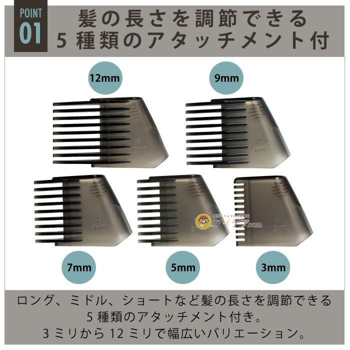 | ■使用上のご注意 | ●高温になる場所(火やストーブのそば、炎天下など)や引火性ガスの発生する場所で使用、放置、保管しないでください。●本体および付属のUSBケーブル、ACアダプターを火中投入・加熱をしないでください。●落とす、踏みつけるなど強い衝撃を与えないでください。●補助を必要とする人や乳幼児、子供の手の届くところに置いたり、使用したりしないでください。●浴室などの水のかかる場所や湿気の多い場所で使用、充電、保管しないでください。●次のような部位には使わないでください。(傷、湿疹、ほくろ、あざ、いぼ、吹出物がある部位)●次のような方は使用を控えてください。(アレルギー体質で皮膚の敏感な方・過度の日焼け、吹出物、かぶれなど肌にトラブルのある方・化学繊維でかぶれた経験のある方・カミソリまけした経験のある方)●家族や他人と共有しないでください。●本来の用途(髪、体毛のカット)以外に使用しないでください。また、乳幼児・ペットへの使用はお避けください。●使用感や仕上がりには個人差があります。 | ||