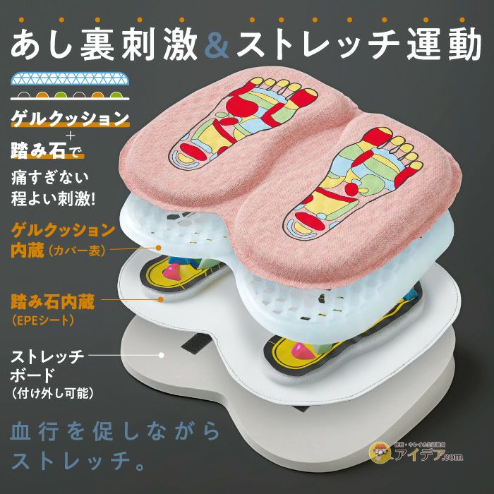 あし裏刺激&ストレッチ運動で血行を促しながらストレッチ! ゲルクッションと踏み石の2重構造で、痛すぎない程よい刺激♪ 下半身の衰え予防・つまずき対策に!
