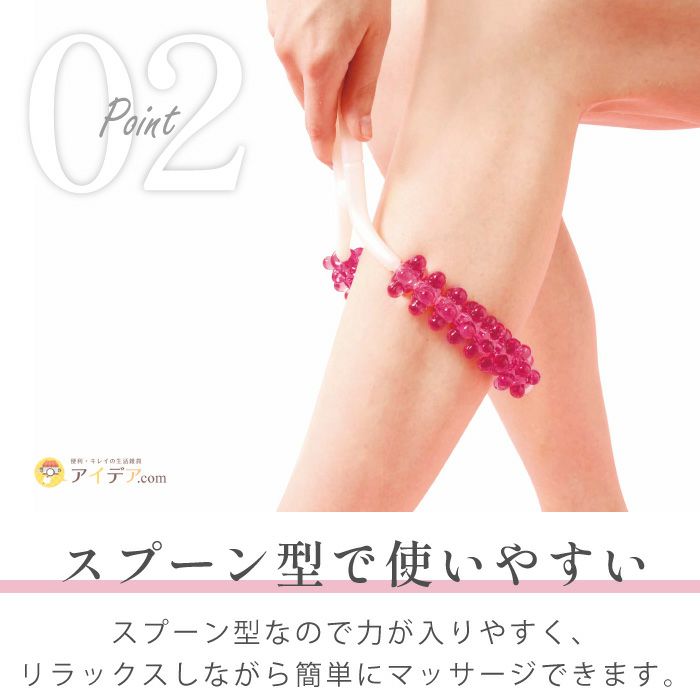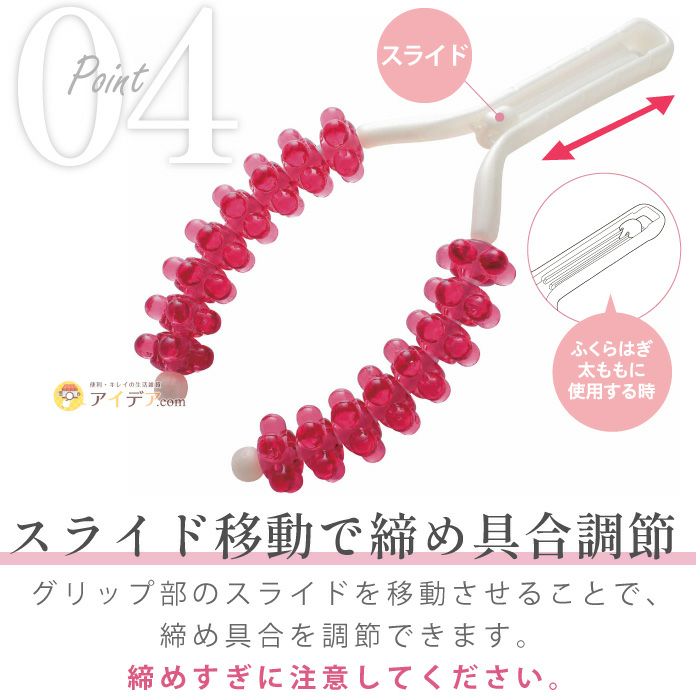 | ■使用上のご注意 | ●ローラーがスムーズに回転することを確認した上でご使用ください。●長時間、同じところへのご使用はお避けください。●お肌の弱い方はご使用をおやめください。●傷やはれもの等、お肌に異常がある場合や日焼けしたお肌にはご使用にならないでください。●お肌を傷めることがありますので、強くマッサージしすぎないでください。●使用中、または使用後に赤み、はれ、かゆみなどの異常があらわれら場合は使用を中止し、皮膚科専門医等にご相談ください。●セルライト軽減には個人差があります。●ご使用後は水または石けん水で洗い、水気をよく切り日陰で自然乾燥させてください。●お子様の手の届かないところに保管ください。●用途以外のご使用はお避けください。 | ||