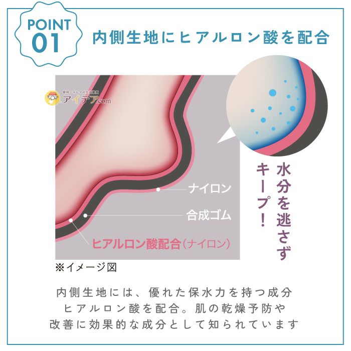 | ■使用上のご注意 | ●ヒアルロン酸の配合は後加工です。洗濯により加工はうすれます。●就寝時など長時間使用する際や締まりすぎると感じる場合は、徐々に慣らしてください。●お肌に異常のあるときは使用しないでください。●お肌に異常があらわれた場合は直ちにご使用をおやめください。●素材の特性上、変色する場合がありますが、品質には問題ございません。●日光や蛍光灯に長時間あてると変色する場合があります。●洗濯により収縮する場合があります。●洗濯機の手洗いモードでは洗えません。●爪や鋭利なものなどでひっかけないようご注意ください。●使用感には個人差があります。●火気厳禁。 | ||