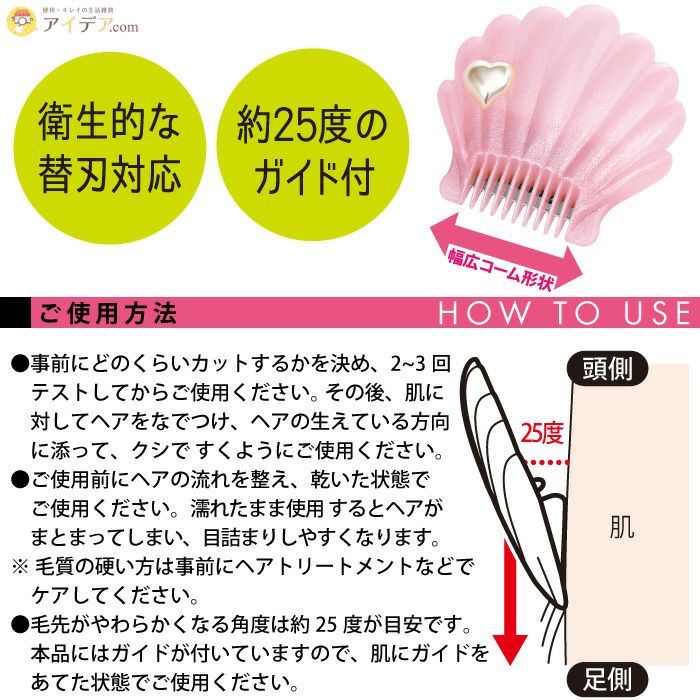 | ■使用上のご注意 | ●お肌に異常が生じていないかよく注意してください。●お肌に合わないときは、ご使用をおやめください。●お肌の弱い方や敏感肌の方、その他医師の治療を受けている方などは絶対に使用しないでください。●傷、はれもの、湿疹、かぶれなど、お肌に異常のある時や、日焼けした肌にはご使用にならないでください。●使用中または使用後に赤み、はれ、かゆみなどの異常があらわれた場合は直ちに使用を中止し、皮膚科専門医などにご相談ください。そのまま使用を続けると、症状が悪化する場合があります。●本品はアンダーヘア専用です。お肌のやわらかい部分や顔部分へのご使用はお避けください。また、見えにくい部分には使用しないでください。●お肌を傷める恐れがありますので、力の入れ過ぎや、本品の取り扱いには十分ご注意ください。また一箇所だけ集中的に使用するのはおやめください。●刃は直接肌に当たらない形状ですが、ヘアを引っ張った状態で使用すると、クシ目に入る恐れがありますのでご注意ください。●サビやカビなどが発生する恐れがありますので湿気の多い場所には保管しないでください。●ご使用後はよくすすぎ洗いし、水気を切って風通しの良い場所で保管してください。●刃の取り扱いには十分ご注意ください。●古くなった刃、サビている刃はご使用にならないでください。●お子さまの手の届かない所に保管してください。また、足もとや落下する恐れのある場所は避けて保管してください。●火気に近づけないでください。●本来の用途以外には使用しないでください。●使用感には個人差があります。 | ||