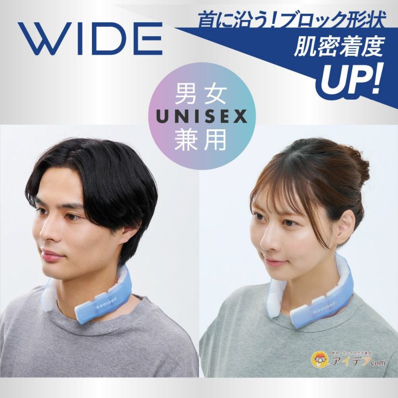温度調節機能を持つ新時代の特殊素材「PCM」を使用したネックリングに、首全体を包み込んでより冷たさを感じられるワイドタイプが登場。気温36℃の環境下でひんやり28℃を3時間キープ!(メーカー調べ)首の接触面積が増えて、ブロック状のシートと樹脂プレートが首にしっかり密着するので、冷感アップ!