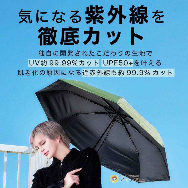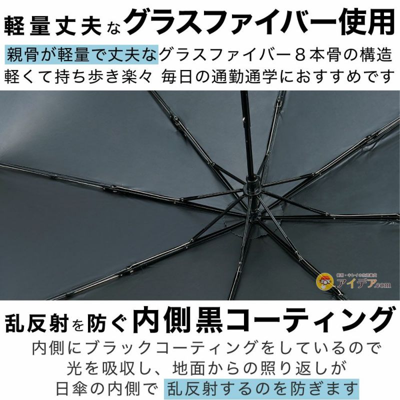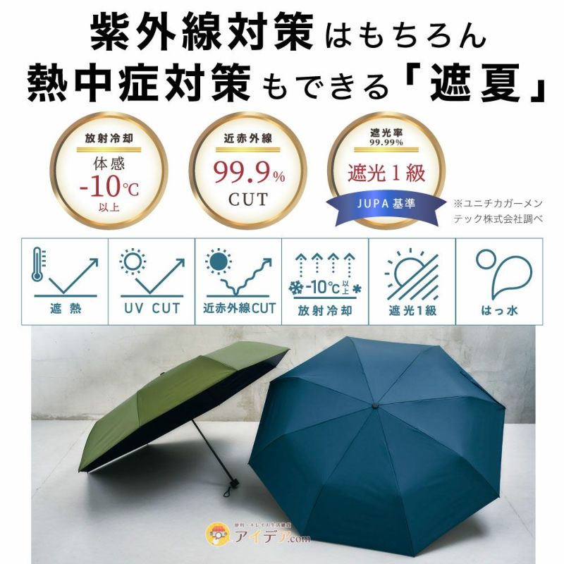 | 機能性 | 日傘 折りたたみ 完全遮光 放射冷却 体感-10℃以上の冷却効果 UVカット率約99.9% UPF50+ 遮光1級 近赤外線カット 遮熱 はっ水 グラスファイバー 晴雨兼用 軽量 黒コーティング 裏面黒 日焼け止め UV 紫外線 紫外線対策 日除け 涼しい |