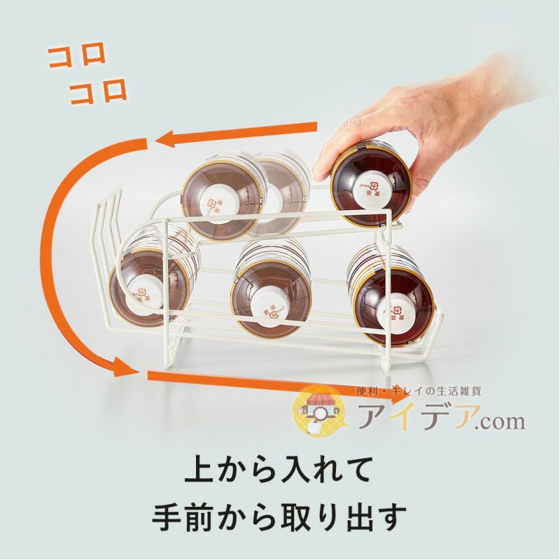 | ■使用上のご注意 | ●本品は500~600mLの丸型ペットボトル専用ストッカーです。●特殊な形状のペットボトルは収納しないでください。●平らな場所でご使用ください。●ペットボトルを勢いよく転がさないでください。●水分や汚れが付着した場合は、水で濡らして固く絞った布や乾いた布などで拭き取った後、陰干ししてよく乾かしてから保管してください。●本品にサビが発生したり、破損した場合は使用しないでください。●お子様が本品で遊ばないようご注意ください。●本来の用途以外には使用しないでください。●火気厳禁。 | ||