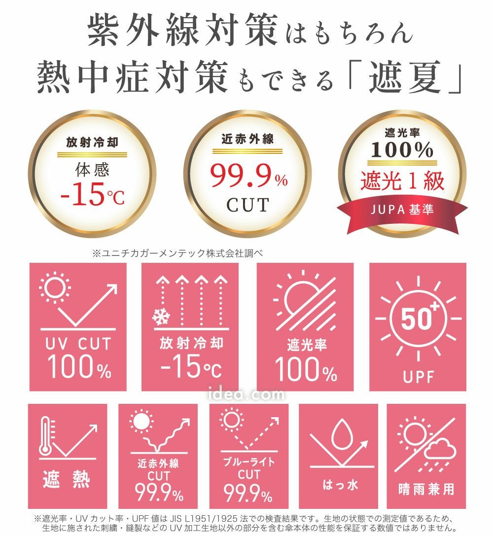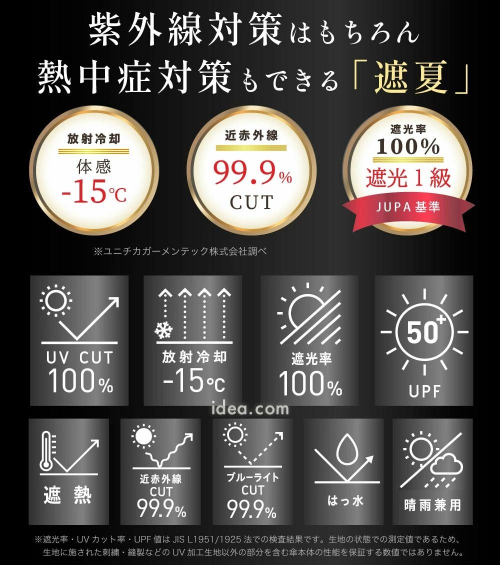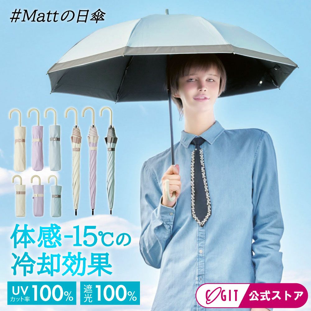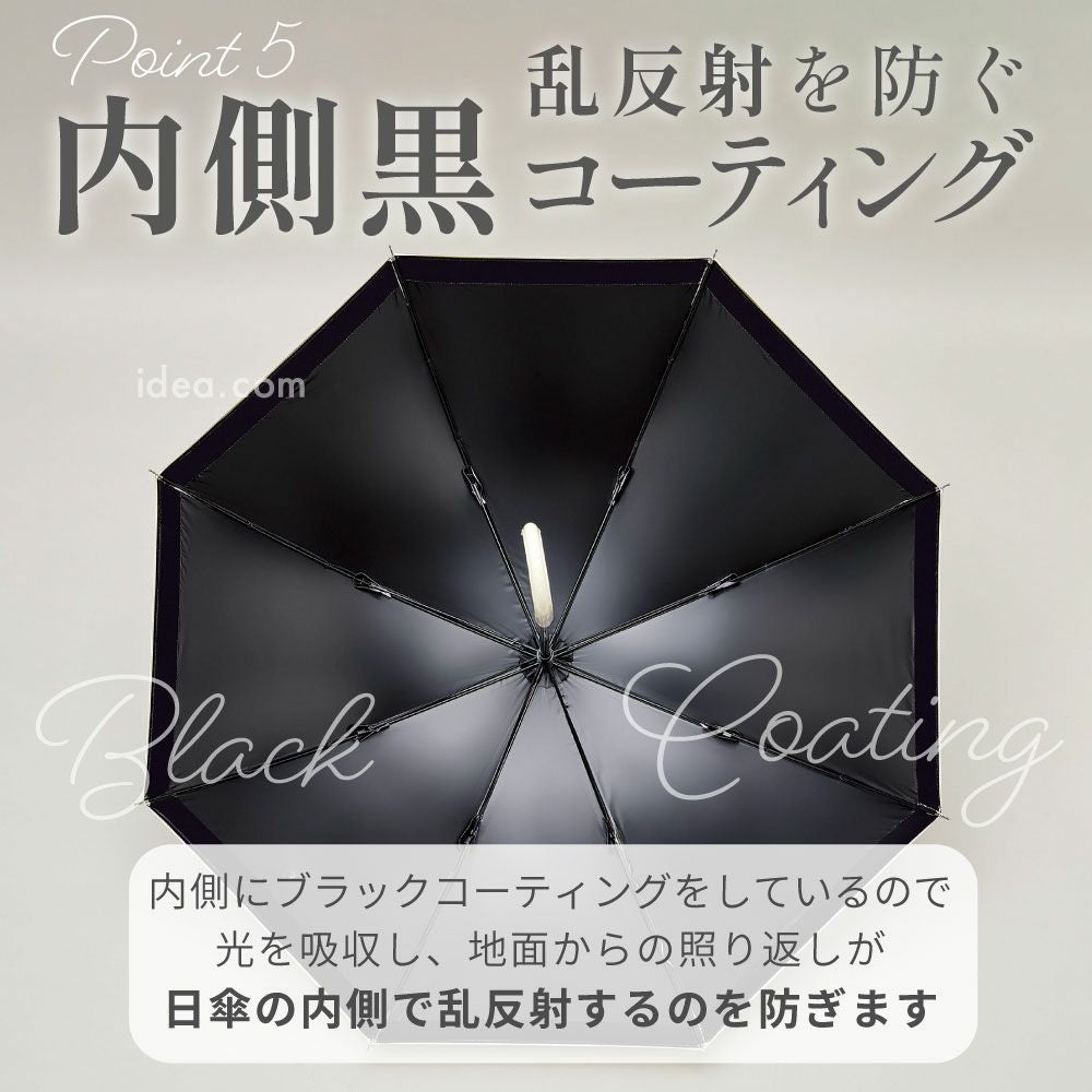 強い日差しや紫外線をしっかり遮る、遮光率100%の生地を使用した日傘です。 UVカット性能に加え、熱を見方にする放射冷却やUPF50+など、高機能で夏には欠かせない必須アイテムです。