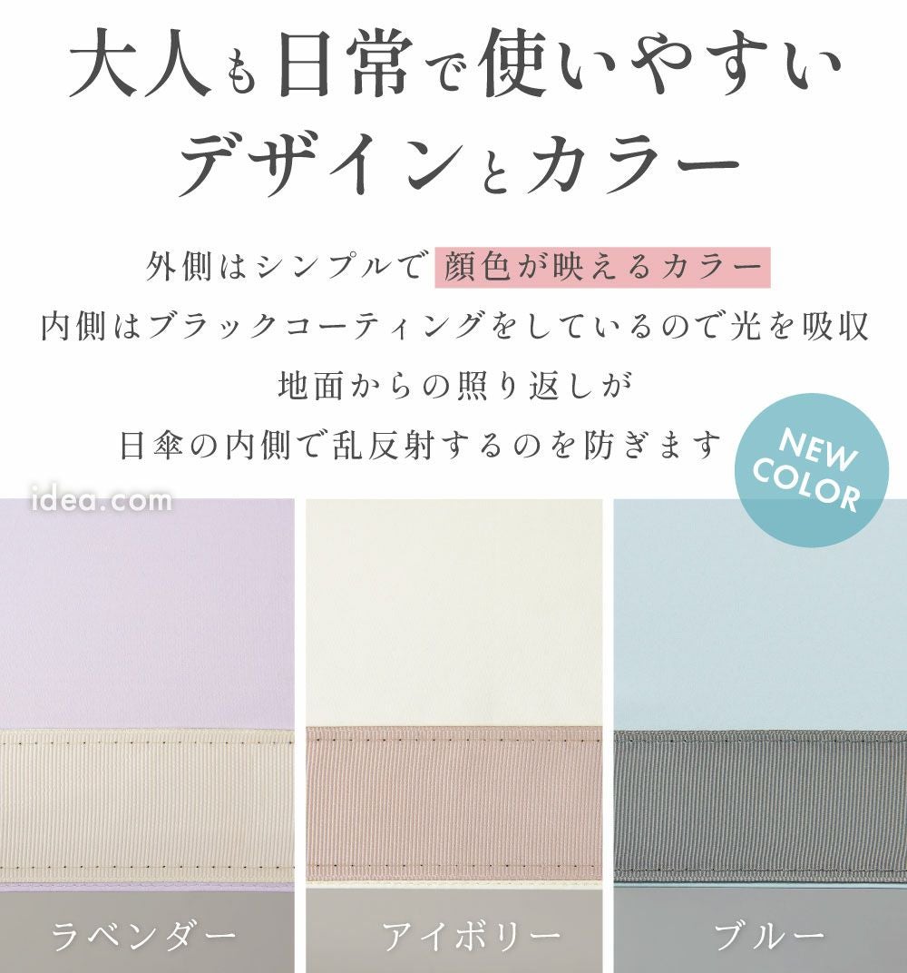 ブラックなど濃色のイメージが強い遮光日傘ですが、 近年では明るいカラーやシンプルなデザインでも遮光100%を実現した商品が増えています。 表地の色だけでなく、裏面加工や素材構造が遮光性能を左右します。