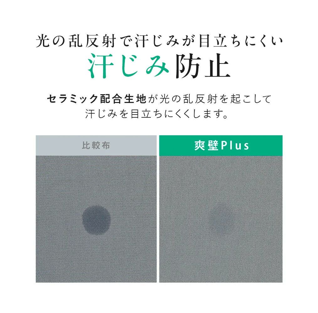 吸水速乾、接触冷感にも優れ、また、セラミック配合生地が汗染みを目立ちにくくします。