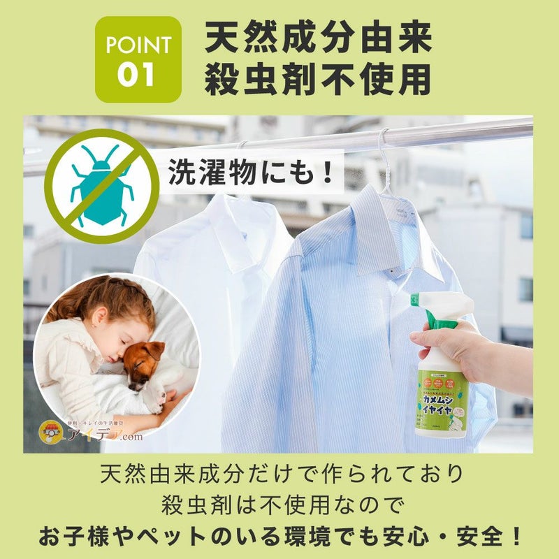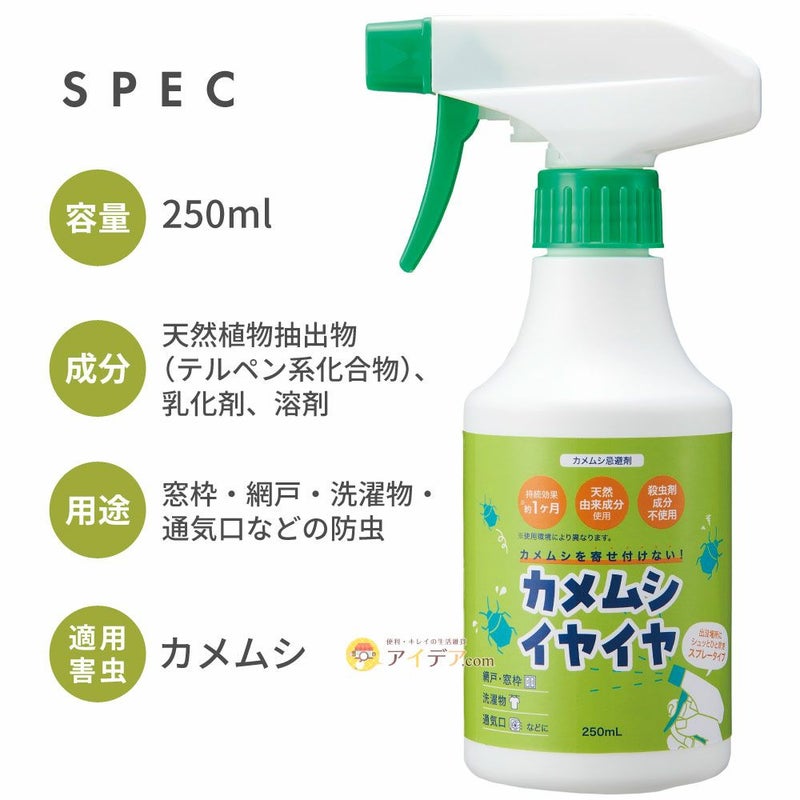 | カメムシを寄せ付けない!安心・安全の忌避剤 カメムシイヤイヤ(スプレータイプ) ![]() ![]() ![]() ![]() ![]() ![]() ![]() ![]() ![]() ![]() ![]() 悪臭を放ち、大量発生するカメムシ対策に! 【カメムシイヤイヤ(スプレータイプ)】は、天然由来成分だけで作られており、殺虫剤は不使用なので人やペットのいる環境でも安心・安全!カンタンスプレータイプで効果は約1ヶ月持続。カメムシが発生しそうないろいろな場所にお使いいただけます。 |