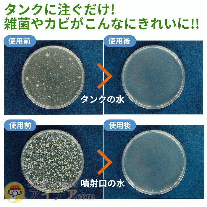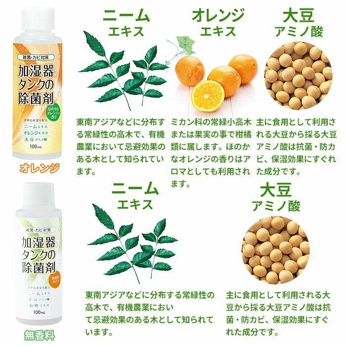 | ■使用上の注意 | 本品は油分を含んでいるため、一部の加湿器には使用できない場合があります。ご使用時に加湿器の取り扱い説明書をご確認ください。本品は加湿器タンク内の水を除菌するもので、空気を除菌するものではありません。全ての菌を除菌するものではありません。 | ||