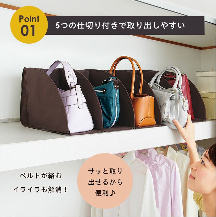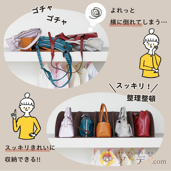 | ■使用上のご注意 | ●素材の特性上、折りじわがついている場合がありますが広げているうちに、徐々に目立ちにくくなります。●必要以上に収納すると破れる恐れがあります。●バッグのデザインによっては収納できない場合があります。●使用状況により、バッグが仕切りの外に出る場合がありますので、落下しやすい不安定な位置での使用はご注意ください。●バッグを収納した状態での本品の持ち運びはバッグが落下する恐れがあります。●破損の原因となりますので、濡れたもの、鋭利なもの、過度に重いものを入れたり、強い衝撃を与えないでください。●素材の特性上、強く引っ張ると破れる恐れがありますのでご注意ください。●素材の特性上、長期間保管していると、気温や湿度によって劣化する場合があります。●強く擦ると他のものに色移りする恐れがあります。●本品は洗濯できません。汚れが生じた場合は、水に濡らして固く絞った布などで拭き取ってください。●直射日光のあたる場所や水回りでの保管、ご使用はお避けください。●火気に近づけないでください。●本来の用途以外には使用しないでください。 | ||
