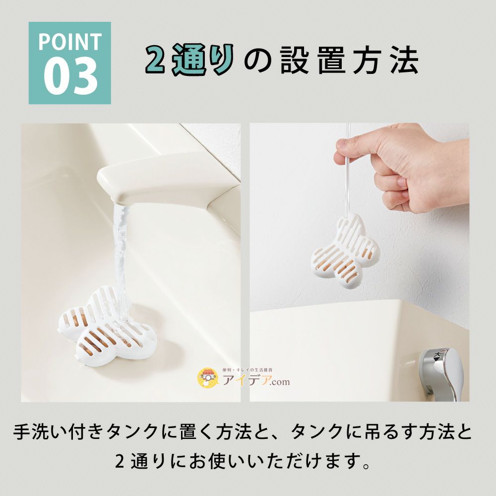 | ■使用上のご注意 | ●本品は食べられません。●お子さまがいたずらしないよう、ご注意ください。●手洗いタンクを掃除する際は、必ず本品を取り外してください。絶対に本品に直接洗浄剤をかけないでください。●バイオが死滅する恐れがありますので、タンク据置タイプの洗浄剤との併用はおやめください。●バイオの効果に影響がありますので、本品設置中にトイレ内で強酸・強アルカリの洗剤や薬品、殺菌・抗菌効果の高い商品との併用はおさけください。●本品の特性上、開封時および設置時しばらく製品特有のにおいがする場合があります。お使い頂くうちににおいは薄まります。また、においによる品質への影響はありません。●効果持続期間は使用状況(水温・排水量)により多少異なります。●バイオは生き物です。環境によって活動が変化するため、効果が目に見えて現れてくる時期は状況によって異なります。●環境下に汚れや悪臭の原因となる物質などの有機物が異常に多い場合、効果を感じるのに時間がかかります。●本来の用途以外には使用しないでください。 | ||