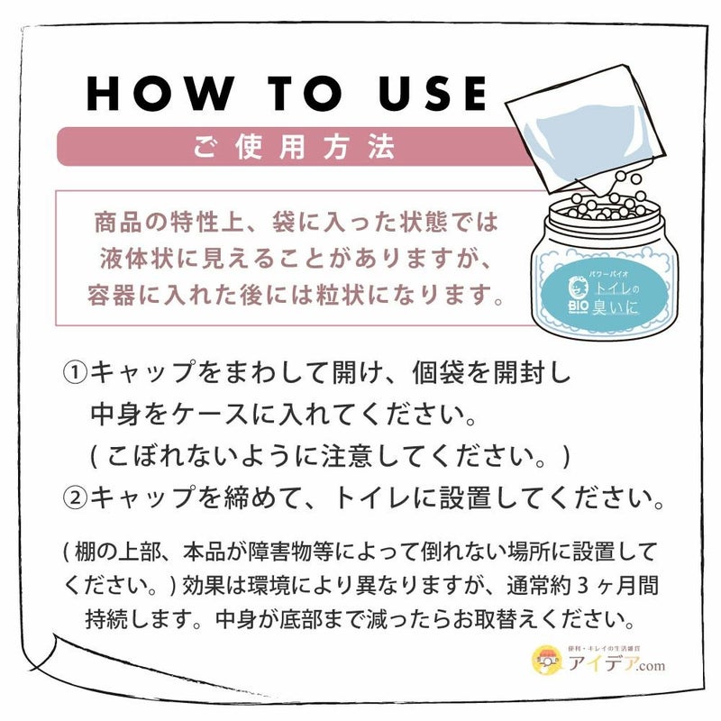 | ■使用上のご注意 | ●お子様の手の届かない場所に設置してください。●本品は食べ物ではありません。●万一誤って食べた場合はすぐに吐き出し、医師にご相談ください。●手についたり目に入った場合は、水で十分に洗い流し、異常のある場合は医師にご相談ください。●環境下に汚れや悪臭の原因となる物質等の有機物が異常に多い場合、効果を感じるのに時間がかかります。●季節や気候、設置場所の状態により効果持続期間が多少異なります。●商品の性質上、底に沈殿物が溜まることがありますが、ご使用には全く影響ありません。●窓際等、直射日光のあたる場所での設置、及び保管はお避けください。変色の原因となる場合があります。●用途以外には使用しないでください。●個袋をハサミ等でカットする際、強く押さえると中身がこぼれるのでご注意ください。●使用後は、お住まいの自治体が定める方法に従って分別してください。 *本品設置中に室内用害虫駆除剤(くん蒸タイプ)を使用されますとバイオが死滅してしまいますのでおやめください。 | ||