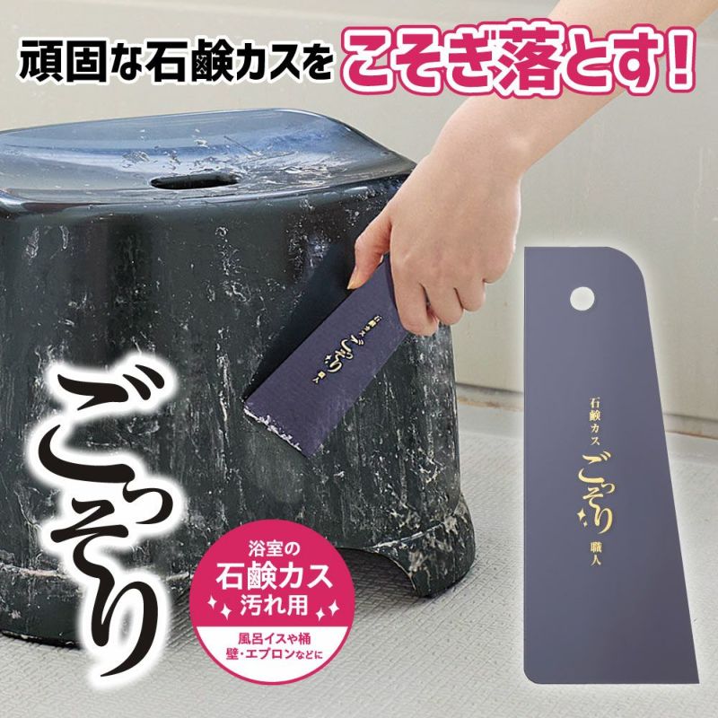 【石鹸カスごっそりすき間職人】は、カチカチに固まった汚れを、こするだけで、カンタンに気持ちよく削ぎ落とすお掃除アイテム。平面も曲面もフィットする形状で、壁・浴槽のエプロン・風呂イス・桶の角まで大活躍!