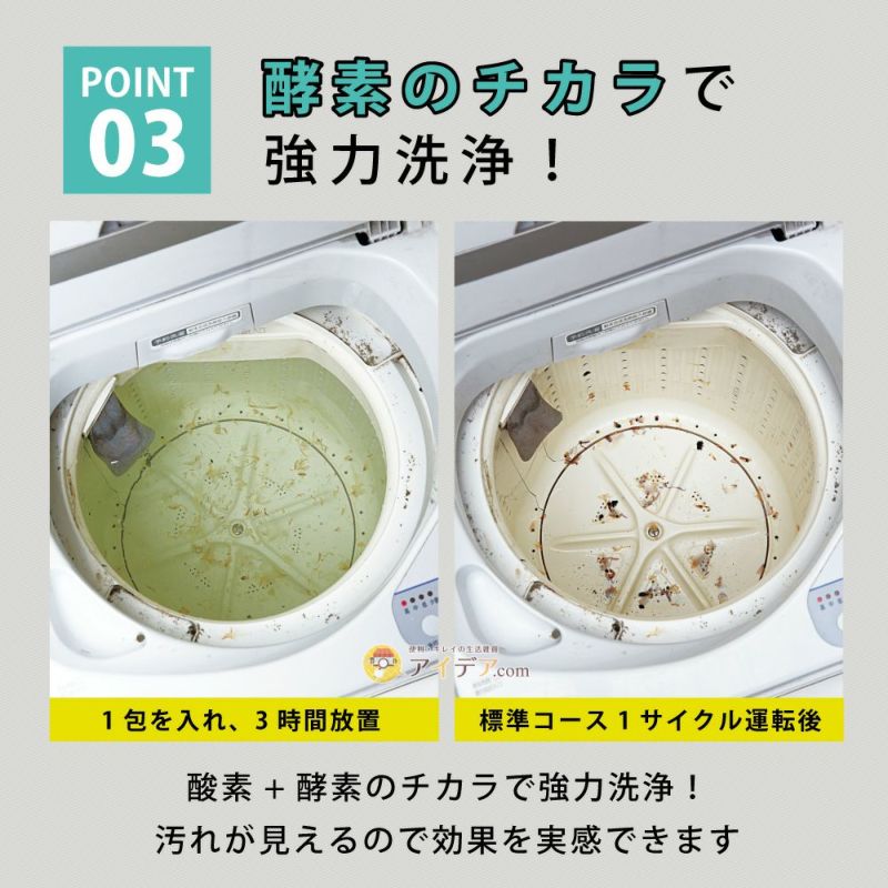 | ■使用上のご注意 | ●本品は食べられません。お子さまの手の届く場所に置かないでください。●万一誤って食べた場合はすぐに吐き出し、医師に相談してください。●洗濯物を入れたまま使用しないでください。●商品の仕様上、パウチに穴があいていますが、使用・保管には問題ありません。●開封後は1回で1包をすべて使い切ってください。●保管状況により固化・分離が生じることがありますが、使用には問題ありません。●効果持続期間は使用状況により異なります。●バイオは生き物です。環境によって活動が変化するため、効果が目に見えて現れてくる時期は状況によって異なります。●環境下に汚れや悪臭の原因となる物質などの有機物が異常に多い場合、効果を感じるのに時間がかかります。●バイオの効果に影響があるため、本品使用中にアルカリ性および塩素系などの薬剤、還元系漂白剤・洗浄剤はご使用にならないでください。●皮膚の弱い方は炊事用の手袋を使用してください。また、使用後は手をよく洗ってください。●本品の粉が舞って吸い込んでしまう恐れがありますので、飛び散りにはご注意の上、開封や投入の際、顔を近づけないようにしてください。●目に入った時は、直ちに十分な水で洗い流し、眼科医に相談してください。●皮膚についた時は、流水で洗い流してください。●直射日光のあたる場所や、高温多湿の場所を避け、冷暗所に保管してください。●本来の用途以外には使用しないでください。 | ||