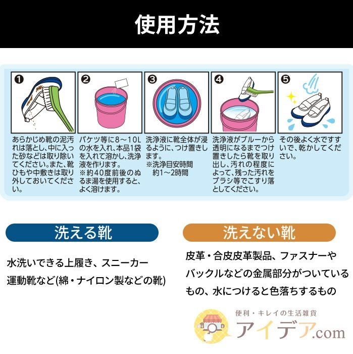| ■使用上のご注意 | ●本品は食べられません。お子さまの手の届く場所に置かないでください。●洗浄する靴の洗濯方法をご確認の上、本品を使用してください。●色落ちなどが心配な靴は、あらかじめ目立たない所で試してからご使用ください。●中敷きが固定されている場合、接着剤がはがれて取れる場合があります。●本品使用の際、アルミ製のバケツは使用しないでください。変色などの原因となります。●熱湯は使用しないでください。●他の洗浄剤と併用・混合はしないでください。●漂白作用がありますので衣服などの洗濯には使用しないでください。●使用する水質や水温、気温によっては洗浄液の色の変化に誤差が生じたり、透明になるまでの時間をかなり所要する場合がありますが、ご使用には問題ありません。●開封した個装袋は使い切ってください。●本品が固まっている場合は、袋の外側からもみほぐし、砕いてからお使いください。●汚れがひどく、洗浄の効果が充分に発揮されない場合は、つけ置き後にブラシなどでのこすり洗いをおすすめします。●皮膚についた時は、流水で洗い流してください。また、荒れ性の方は手荒れ防止のため、ゴム手袋をご使用ください。また使用後は、手を水でよく洗いクリーム等でのお手入れをおすすめします。●本品の粉が舞って吸い込んでしまう恐れがありますので、飛び散りにはご注意ください。●目に入った時は、直ちに十分な水で洗い流し、眼科医に相談してください。●飲み込んでしまった時は、無理に吐かせず直ちに口をすすぎ、すぐに医師の診察を受けてください。●直射日光及び、高温多湿になる場所を避け、冷暗所に保管してください。●用途以外には使用しないでください。 | ||