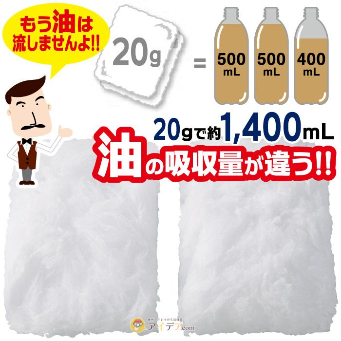 | ■使用上のご注意 | ●必ず油を冷ましてから(目安50℃以下)ご使用ください。 ●油の種類によっては油が吸収しにくい場合があります。 ●本品は水には溶けません。●高温、直射日光を避けて保管してください。 ●本品は食べられません。 ●お子さまの手の届かない所で保管してください。 ●火気厳禁。 | ||