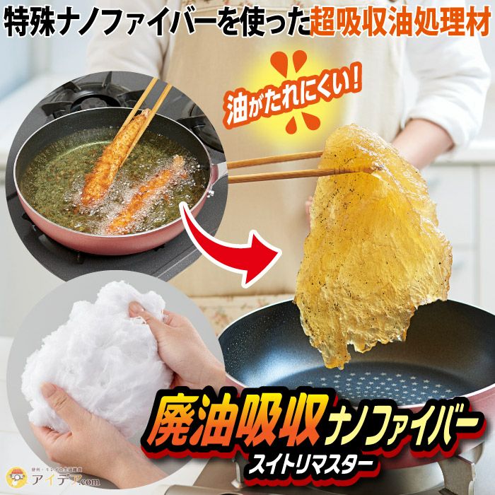 | たった1gで約70mLの油をしっかり吸収!60gの大容量パック! 廃油吸収ナノファイバー スイトリマスター 60g ![]() ![]() ![]() ![]() ![]() ![]() ![]() ![]() 特殊ナノファイバーを使った超吸収油処理材!ちぎって使えて便利♪たった1gで約70mLの油をしっかり吸収! 揚げ油の処理だけでなく、コンロまわりの油汚れや、油まみれの食器の拭き取りにもお使いいただけます。安心の日本製!60gの大容量パックです! |