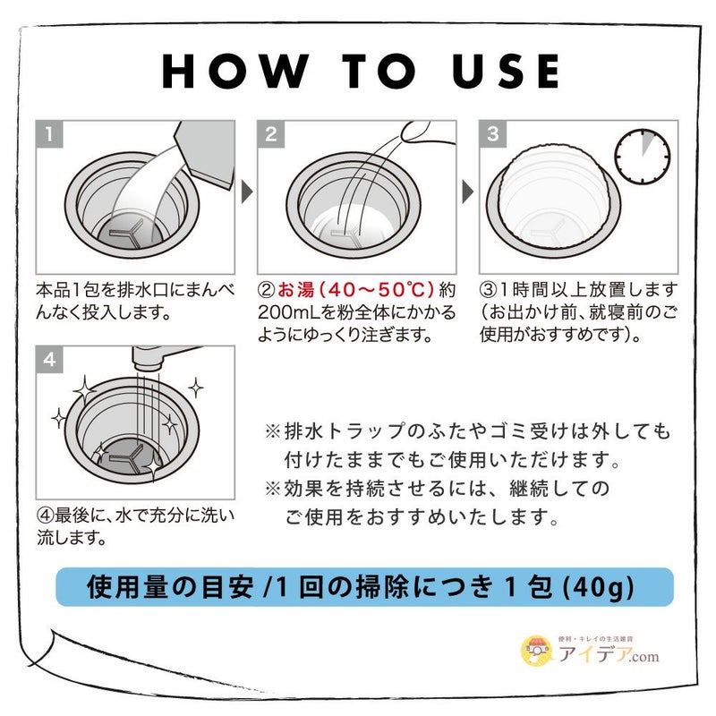 | ■使用上のご注意 | ●塩素系タイプの製品と混ぜると有害なガスが発生し危険です。他の洗浄剤と併用しないでください。●本品は食べられません。お子さまの手の届く場所に置かないでください。●万一誤って食べた場合はすぐに吐き出し、医師に相談してください。●サビが発生する恐れがありますので、銅製・アルミ・鉄製の排水口にはご使用にならないでください。●本品の特性上、開封時および設置時しばらく製品特有のにおいがする場合があります。お使い頂くうちににおいは薄まります。また、においによる品質への影響はありません。●効果持続期間は使用状況(水温・排水量)により多少異なります。●バイオは生き物です。環境によって活動が変化するため、効果が目に見えて現れてくる時期は状況によって異なります。●環境下に汚れや悪臭の原因となる物質などの有機物が異常に多い場合、効果を感じるのに時間がかかります。●バイオの効果に影響があるため、本品使用中にアルカリ性および塩素などの薬剤はご使用にならないでください。●本品の粉が舞って吸い込んでしまう恐れがありますので、飛び散りにはご注意ください。●目に入った時は、直ちに十分な水で洗い流し、眼科医に相談してください。●皮膚についた時は、流水で洗い流してください。●高温多湿の場所を避け、冷暗所に保管してください。●本来の用途以外には使用しないでください。 | ||