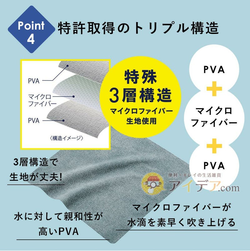 | ■使用上のご注意 | ●本品の特性上、乾いた状態では硬いため、拭いた物を傷つける恐れがあります。本品は必ず水に濡らし、よく絞って水気を切った状態でご使用ください。●ゴミなどが付着したままご使用になると、拭いた物に傷をつける恐れがありますのでご注意ください。●汚れの程度によっては本品に汚れが残ったり、完全に落ちない場合があります。●使用状況によって本品の効果が弱まる場合があります。●ご使用後は水洗い、または弱アルカリ性洗剤で洗い、汚れを十分に落とした後、固く絞り形を整え、風通しのよい場所で陰干ししてください。●本品を汚れたまま放置しないでください。●漂白剤や柔軟剤の使用はお避けください。また、煮沸消毒はしないでください。●素材の特性上、ご使用状況により収縮する場合があります。●鋭利なものなどでひっかけないようご注意ください。●火気厳禁。 | ||