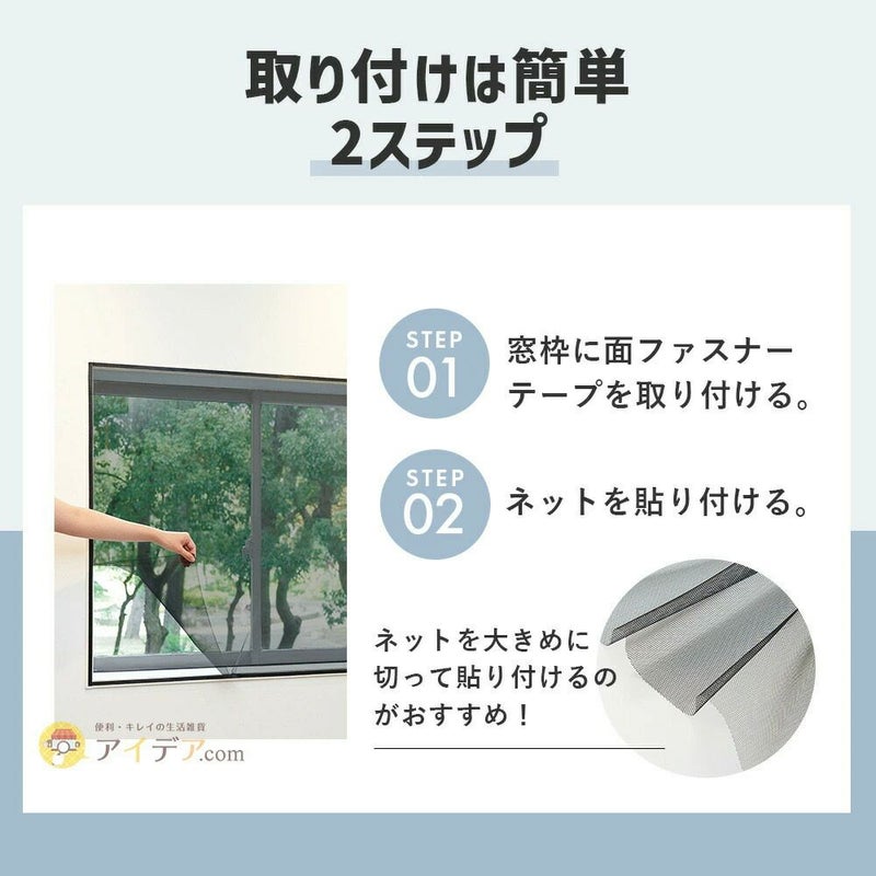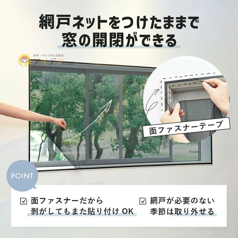 この「貼るだけ簡単!抗菌網戸ネット」なら面ファスナーテープで簡単に網戸を取り付けることが出来ます!