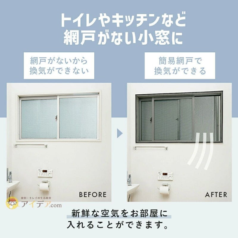 今まで網戸がなくて換気できなかったトイレやキッチンなどの窓にもぴったり。虫が入ってくるのを気にせずに、新鮮な空気をお部屋に入れることができます。
