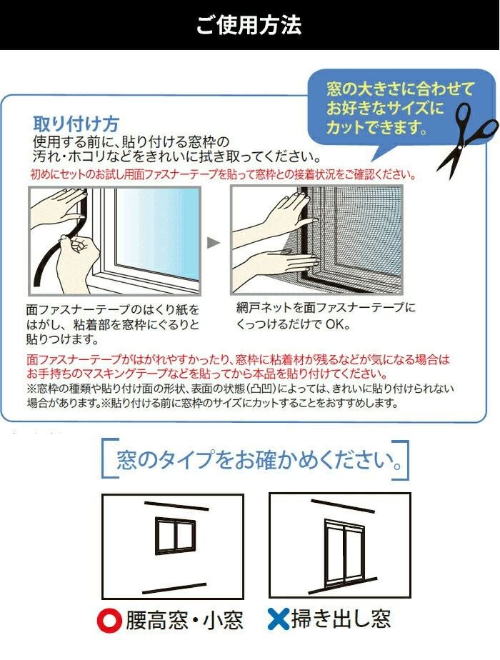 | ■使用上のご注意 | 掃き出し窓には使用できません。●風雨が強い時のご使用はお避けください。●鋭利なもので突き刺さないようご注意ください。●犬や猫など、ペットが引掻いたり、本品にもたれると、破れたり枠から外れますので、ご注意ください。●汚れが生じた場合は、網戸ネットのみを水洗いしてください。面ファスナーテープは水に濡れると、はがれやすくなりますのでご注意ください。●本品は水洗いにより、多少縮む恐れがあります。●本品は粘着式のため、はがす際に貼り付け面を傷つける恐れがあります。気になる場合はお手持ちのマスキングテープなどを貼ってから本品を貼り付けてください。●本品を長期間貼り付けてはがす際は、端からゆっくりと丁寧にはがすようにしてください。●使用条件や使用期間によってはがしにくくなったり、粘着剤が残る場合があります。粘着剤が残った場合は、市販のシールはがしなどを使用してください。●火気に近づけないでください。●本来の用途以外には使用しないでください。●賃貸物件などで復元が必要な場合はよくご確認の上、使用してください。 | ||