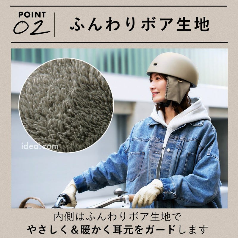 | つけるだけ、防寒上級者!ヘルメットも冬コーデ! おしゃヘル ヘルメットイヤマフ ![]() ![]() ![]() ![]() ■写真の【おしゃヘル クロシェ】はこちらから♪ ![]() ![]() ![]() ![]() 本品は、指定のヘルメットに取り付ける自転車ヘルメット用イヤマフ(耳あて)です。「おしゃヘル(ヘルメット)」型番OSH-X-Y※に適応します。指定のヘルメット以外に本品を使用しないでください。 寒い季節の自転車通勤・通学も、おしゃれに快適に。「おしゃヘル ヘルメットイヤマフ」は、手持ちのおしゃヘル ヘルメットにスナップで簡単装着できる冬用イヤマフです。内側はふんわりボア生地で耳元をやさしく包み込み、冷たい風をしっかりガード。外側ははっ水加工で急な雨や雪の日も安心! 取り付けはあご紐に通してヘルメット内側にループを通し、スナップボタンで固定するだけだから、工具も不要でラクラク。ブラックとアースグレーの2色展開で、おしゃヘルのヘルメットや帽子と合わせやすく、通勤・通学はもちろん、アウトドアや街乗りでも大活躍!「防寒グッズ」「自転車用イヤーマフ」「ヘルメット用耳あて」などを探している方にもおすすめです。おしゃれと機能性を両立した防寒アイテムで、冬のサイクリングをもっと楽しく暖かく! ![]() |