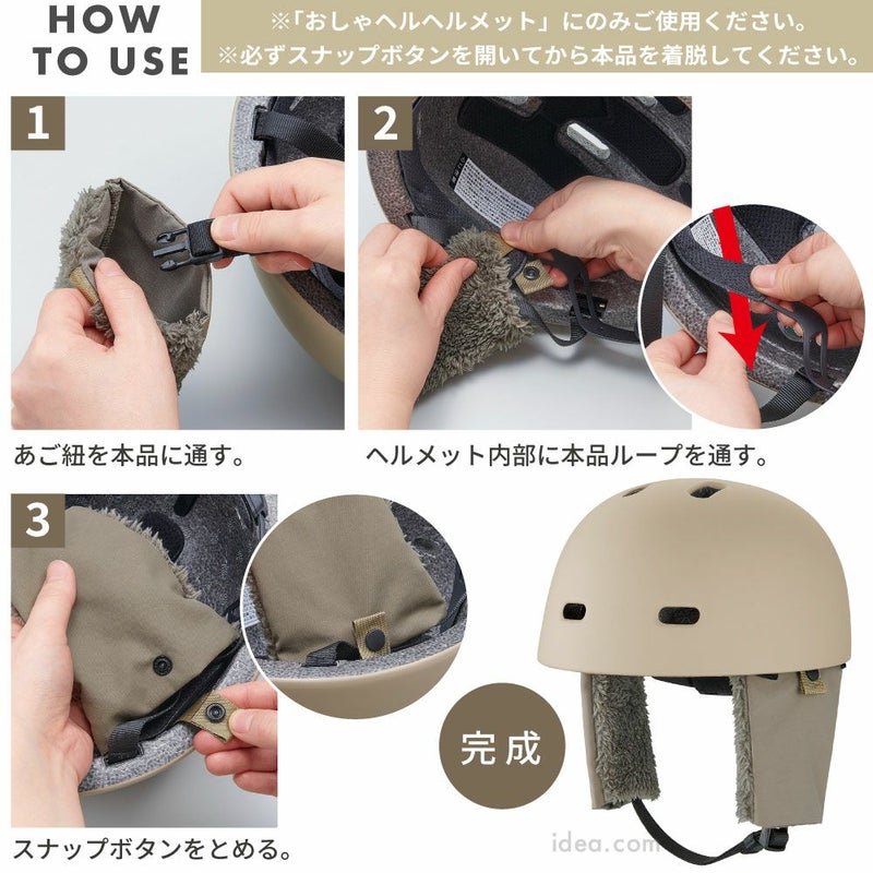 | ■使用上のご注意 | ●ヘルメットに関しての注意事項は「おしゃヘル?(ヘルメット)」の取扱説明書をご確認ください。●頭のサイズに合ったヘルメットを選び、サイズ調節機能を用いて正しいサイズに調節を行ってから着用してください。●お子さまが着用される場合は、保護者の方が注意事項・正しいヘルメットのかぶり方をよくご理解のうえ、お子さまへ使用方法の指導をお願いします。但し、6歳未満の幼児または、6歳以上でも頭のサイズが合わない場合は使用しないでください。●着用や洗濯により、抜けたボアが付着することがあります。●洗濯機の手洗いモードでは洗えません。●洗濯の際は必ず形を整えてから陰干ししてください。●火気厳禁。 | ||