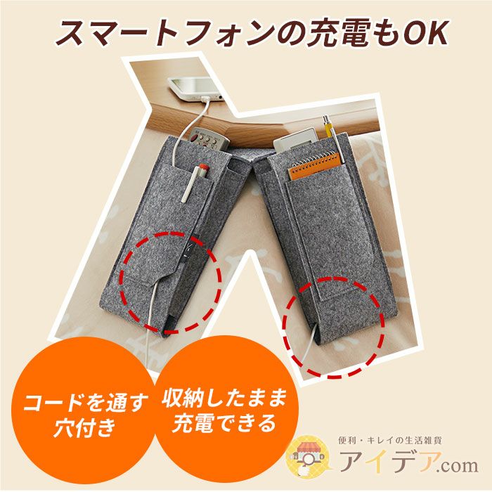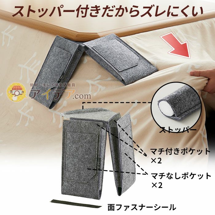 | こたつの周りの小物をすっきり収納!スマートフォンの充電も入れたままでOK felsto こたつコーナーポケット ![]() こたつを使っていると、物を置くようになって、いつの間にか台の上が物置状態に…。