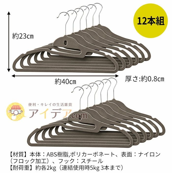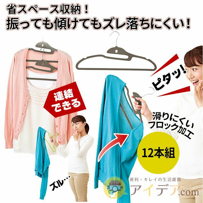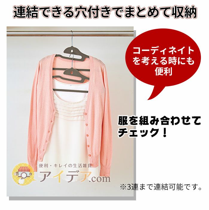 | ■使用上のご注意 | ●収納専用ハンガーです。洗濯ハンガーとしては使えません。●強くこすると色落ちする可能性があります。また濡れた洗濯物や汗などで湿った洋服には、色移りする可能性がありますので、ご使用にならないでください。●フック部は回転式です。固い場合、無理に回すと破損する可能性があります。●ハンガー同士を連結させて吊るす際は、3本までとしてください。●破損の原因となるため、過度な荷重や衝撃を与えないでください。●長時間直射日光に当てないでください。●お子さまの手の届かない所に保管してください。●火気に近づけないでください。●本来の用途以外には使用しないでください。 | ||