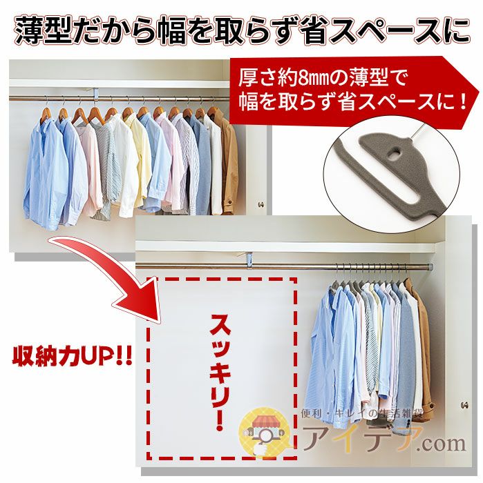今使っているハンガーを入れ替えれば、クローゼットの収納力もアップするので、新しい洋服を買い足すこともできます。 |