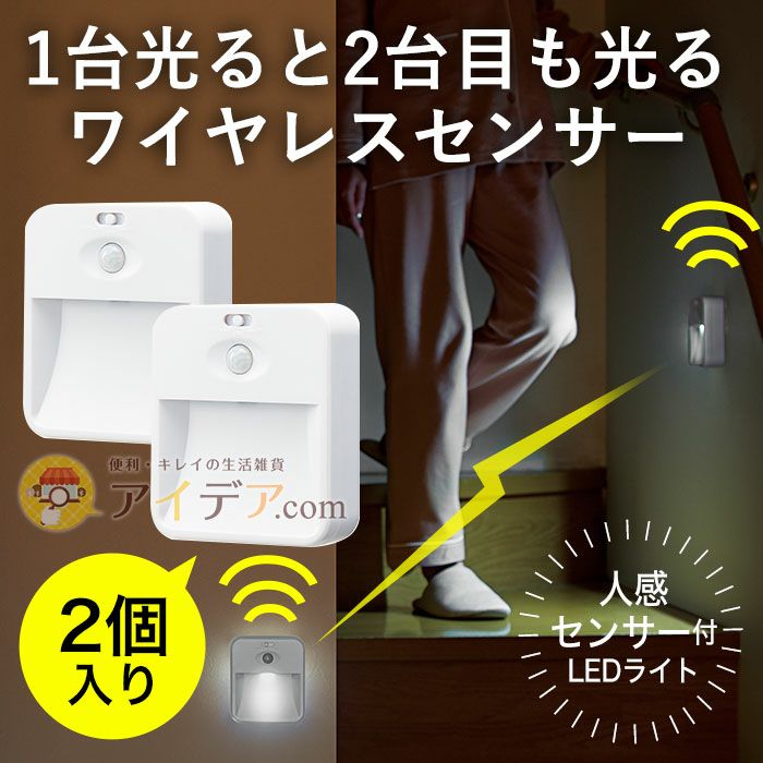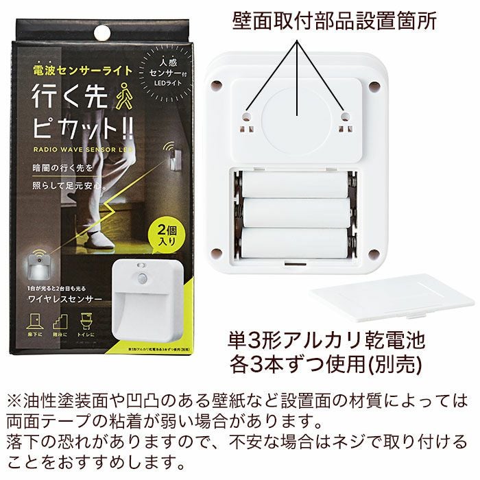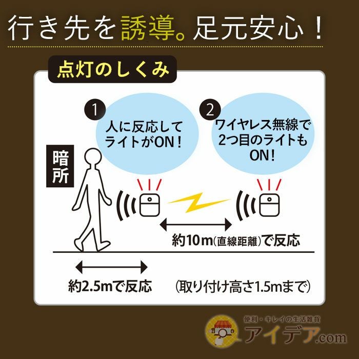 | ■使用上のご注意 | ●落下させる、踏みつける、投げつけるなど強い力や衝撃、振動を与えるなど本体が破損するようなことはしないでください。万が一落下しても安全な場所に取り付けてください。●点灯中のライトを直視しないでください。●布や紙など燃えやすい物の近くに取り付けないでください。●本品を水に浸けないでください。●本品は周囲の明るさと温度変化を感知するため、以下のような場所では取り付けないでください。誤作動や感知しない場合があります。・他の照明器具などがある明るい場所・カーテンの近くや風などで揺れる植物の近く・風が吹き込む窓の近くやエアコンなどの送風を受けるところ・ペットの通るところ・取り付け高さが1.5m以上のところ・電波の強いところ・暖房器具の近く・モーターなど磁場が発生する機器の近く・大理石の床や壁など光の反射を受けるところ・ガス機器や排気口など温度の高くなるものの上・不安定なところ・強い衝撃を受けるところ●本品を以下のような場所に取り付けないでください。故障やトラブルの原因となります。・直射日光が当たる場所・水がかかる場所・浴室など湿気の多い場所・浸水するおそれのある場所・置いて使用する場合は、転倒して危険な場所●乳幼児の手の届く場所に置かないでください。また、乳幼児や子どもが本品で遊んだり一人で使用したりしないように注意してください。●火気厳禁。 | ||