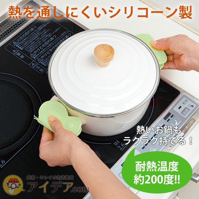 | ■使用上のご注意 | ●本品は熱くなった鍋や陶器をつかんで移動させるための補助具です。本来の用途以外では使用しないでください。●素材の特性上、使い始めはシリコーンゴム特有の臭いを感じる場合がありますが、ご使用には問題ありません。●ご使用の際は本品から指がはみ出さないように注意してください。やけどをする恐れがあります。●重い鍋や陶器に使用される場合は、必ず本品を2個使用し、両手でつかんでください。●本品を無理にひねったり、折り曲げたりすると磁石がはずれたり破損する恐れがあります。●素材の特性上、本品に食材の匂いが付いたり、変色する場合がありますが、ご使用には問題ありません。●本品が破損、または使用中に破損した場合は、ただちに使用を中止してください。●汚れが付いた場合は軽く水洗い、もしくは中性洗剤で洗ってください。●タワシや研磨剤入りのクレンザー、漂白剤などは使用しないでください。傷や破損など、劣化の原因となります。●使用する前に、貼り付ける面についた汚れ・ホコリなどをキレイに拭き取ってください。水拭きをした際はしっかりと乾かしてから本品を使用してください。●お子さまの手の届かない所に保管してください。●火気に近づけないでください。 | ||