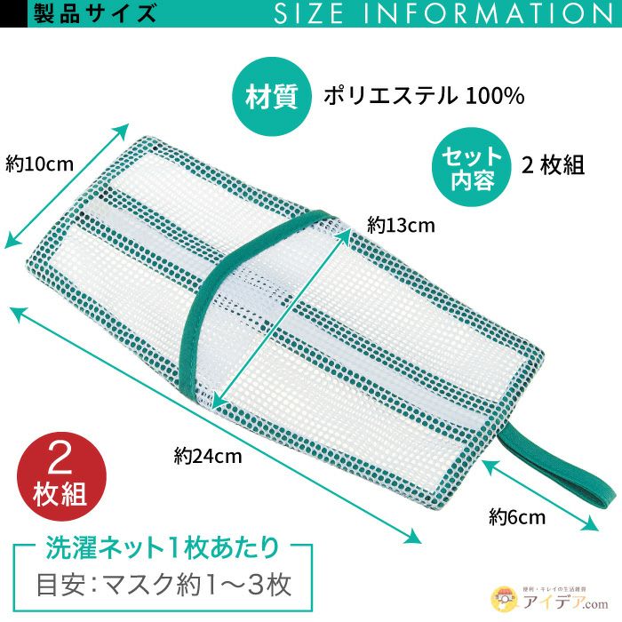 | ■使用上のご注意 | ●ご使用前に洗濯が可能なマスクかご確認ください。●洗濯機の故障の原因となりますので、マスクに装飾品がついている場合は外してから洗濯してください。●素材の特性上、強く引っ張ると破れる恐れがあります。鋭利なものなどでひっかけないようご注意ください。●使用状況によりますが、使用しているうちにメッシュ部がこすれて穴があく場合があります。●マスクの材質によっては、十分に脱水できない場合があります。その場合は向きを変えるなど、入れ直してから再度脱水してください。●マスクにマジックなどで名前を書いている場合、洗濯することで薄くなる場合があります。●厚手タイプや、特殊な形状のマスクの場合、本品に入らない場合があります。●ファスナーを開けたまま洗濯しないでください。ファスナーは閉め、スライダーをファスナーポケットに入れてから洗濯してください。●洗濯するマスクの素材や形状により、ネット内で片寄る場合があります。その場合は干す前に形を整え、ネット上から叩き押しをして干してください。●日光のあたる場所などに放置すると劣化する恐れがあります。●本品は洗濯により収縮する恐れがありますので、形を整え陰干ししてください。●使用後は、風通しの良い場所で乾燥させてから保管してください。●お子さまが本品で遊ばないようご注意ください。●火気に近づけないでください。●本来の用途以外には使用しないでください。 | ||