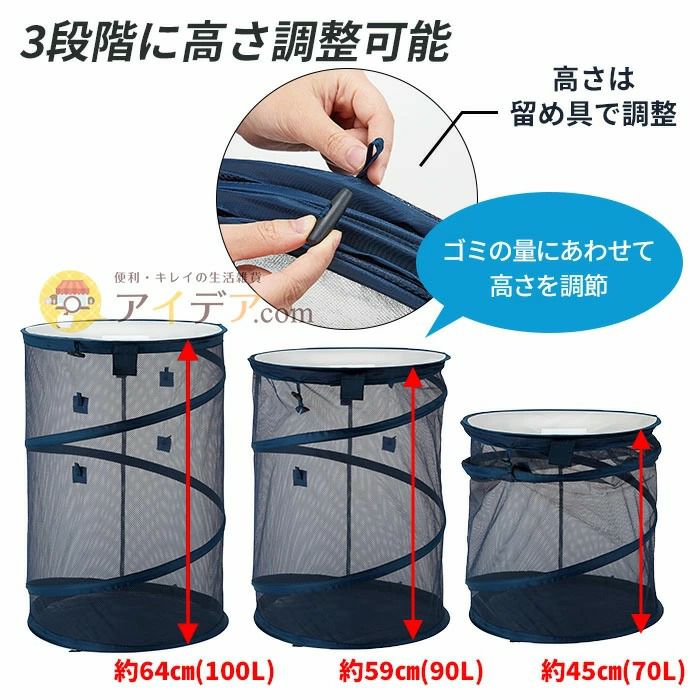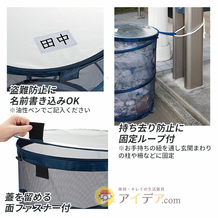 | ■使用上のご注意 | ●開封時やサイズ調整時に本品が広がり、勢いよく飛び出す恐れがありますのでご注意ください。●ご使用時は、固定用ループにお手持ちのヒモを通し、玄関まわりの柱や柵などに結び、しっかりと固定してください。●本品にゴミを入れた際は、必ずフタを閉じてご使用ください。●破損の原因となりますので、ゴミを入れたまま本品を持ち上げたり引きずらないでください。●風にあおられる恐れがありますので、台風や強風時には使用しないでください。●本品の特性上、サイズ調整の際に左右均等にならない場合がありますが、ご使用には問題ありません。●必要以上に強く引っ張ったり、鋭利なものなどで突き刺したり、引っかけたりしないでください。また、過度に重いものを中に入れたり、荷重や衝撃を与えないでください。●ワイヤー部など、本品に破損が生じた場合は、ただちにご使用をおやめください。●本品の中に入ったり、本品の上に乗るなど、お子さまが本品で遊ばないようご注意ください。思わぬ事故の原因となります。●本品は洗濯・水洗いできません。使用後や汚れが生じた場合は、水に濡らして固く絞った布などで拭き取ってください。●未使用時は、陰干しして乾燥させてから屋内で保管してください。●使用時以外は、屋外に放置しないでください。雨などで濡れたまま放置するとカビやサビの原因となります。●水や汗などにより湿った状態で強く擦ると他のものに色移りする恐れがあります。万一、衣服などに色移りした場合は早めに洗濯してください。●火気に近づけないでください。●本来の用途以外には使用しないでください。 | ||