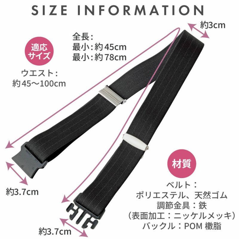 | ■材質 | ベルト:ポリエステル、天然ゴム、 調節金具:鉄(表面加工:ニッケルメッキ) バックル:POM櫢脂 | ||