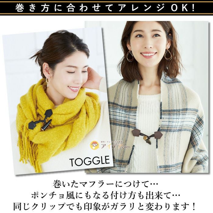 | ■使用上のご注意 | ●素材の特性上、色の出方や形状が異なる場合があります。●お子さまが本品で遊ばないようご注意ください。●使用時に首をしめつけないよう十分ご注意ください。●マフラー・ストールなどの厚み、材質やデザインによっては取り付けられない場合があります。●本品を取りはずすときは、必ずクリップを開いてからはずしてください。クリップを開かず強く引っ張ると、生地を傷めたり、商品が破損する恐れがあります。●日光や蛍光灯に長時間あてると変色する恐れがあります。●強く擦ると他のものに色移りする恐れがあります。万一衣服などに色移りした場合は早めに洗濯してください。●雨や水に濡れると色落ちしたり風合いを損なう恐れがあります。また、そのまま保管するとカビが生える恐れがありますのでご注意ください。●直射日光の当たらない、湿気の少ない場所に保管してください。●火気に近づけないでください。●本来の用途以外には使用しないでください。 | ||