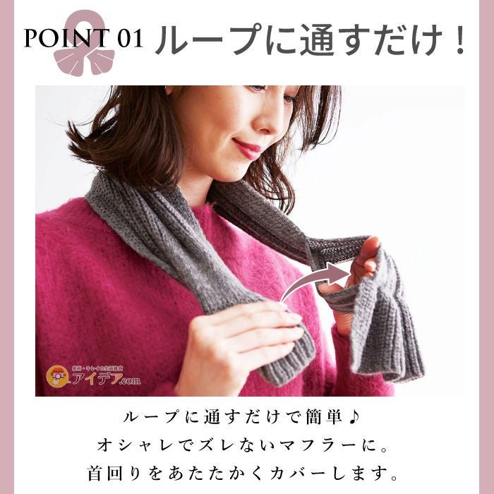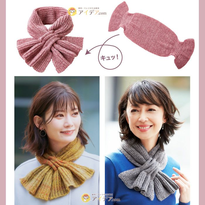 | ■使用上のご注意 | ●ループに本体を通す際は、引っかからないようにご注意ください。●無理に引っぱると、伸びや破れの原因となりますのでご注意ください。●鋭利なものなどでひっかけないようご注意ください。●お肌の弱い方、アレルギー体質の方はご使用にならないでください。●使用中、使用後に赤み、はれ、かゆみなどの異常があらわれた場合は直ちにご使用をおやめください。●素材の特性上、摩擦により毛玉が生じる場合があります。その際は無理に引っ張らずにハサミなどで取り除いてください。●本品の特性上、色の出方が異なったり、色がまだらにみえる場合があります。●使用時に首をしめつけないよう十分ご注意ください。●洗濯機の手洗いモードでは洗えません。●この商品は洗濯により伸縮する恐れがあります。手洗い後は形を整え陰干ししてください。●火気に近づけないでください。●お子さまが本品で遊ばないようご注意ください。●本来の用途以外には使用しないでください。 | ||